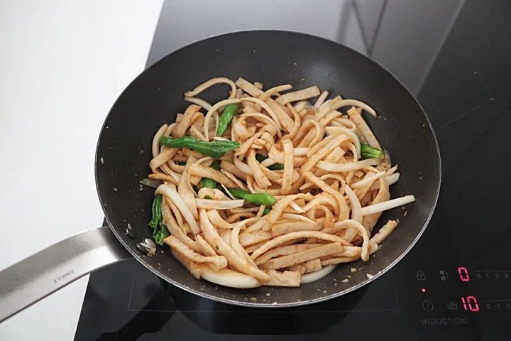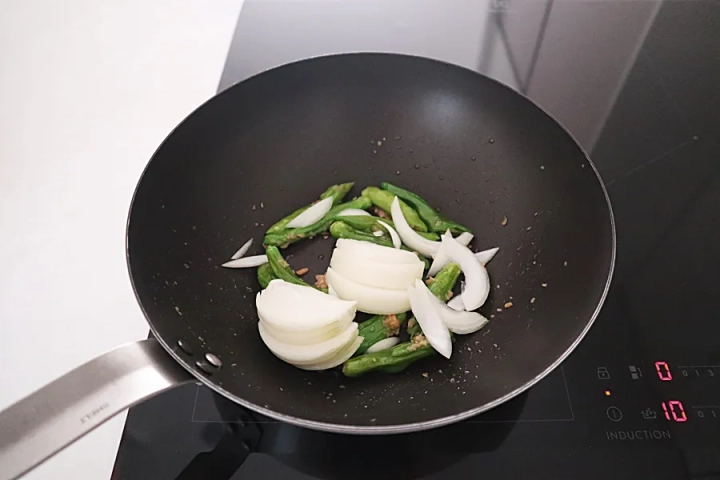 마늘향이 올라오면 꽈리고추와 양파를 더해 볶아주세요.