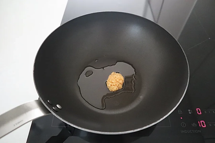 달군 팬에 식용유를 둘러주고 다진마늘을 볶아주세요.