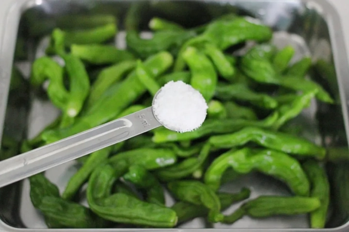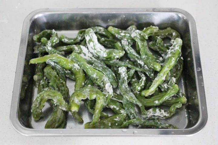 [재료]: 꽈리고추 200g, 소금 1작은술, 밀가루 3큰술