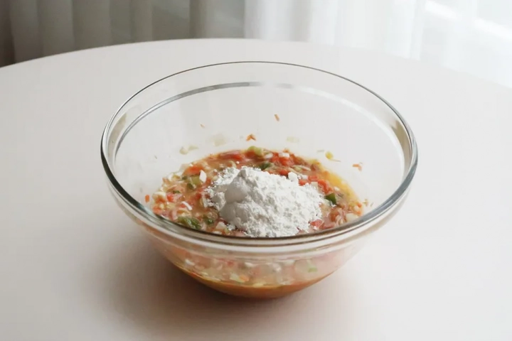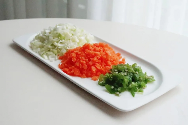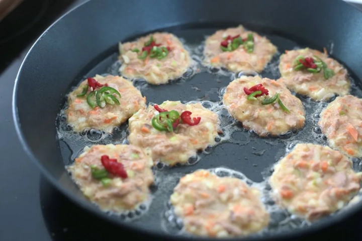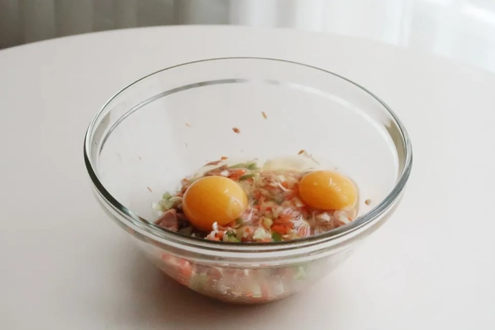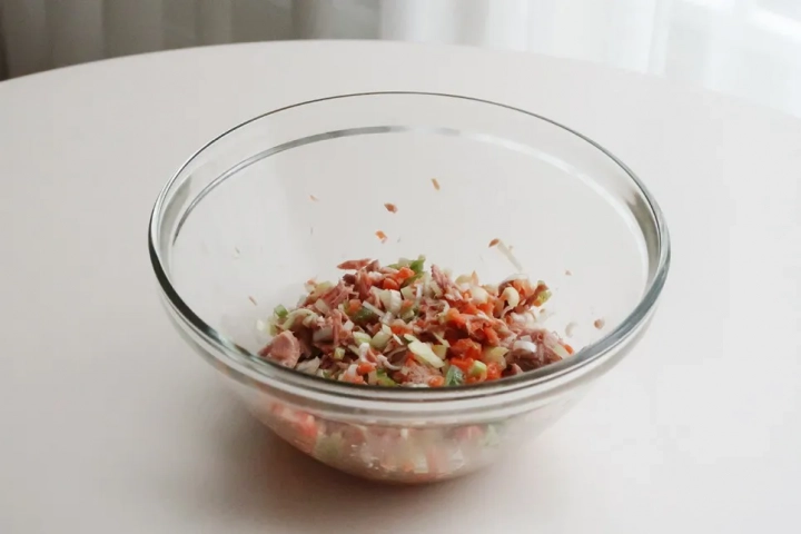 참치는 기름기를 제거하고 다진 채소를 넣어