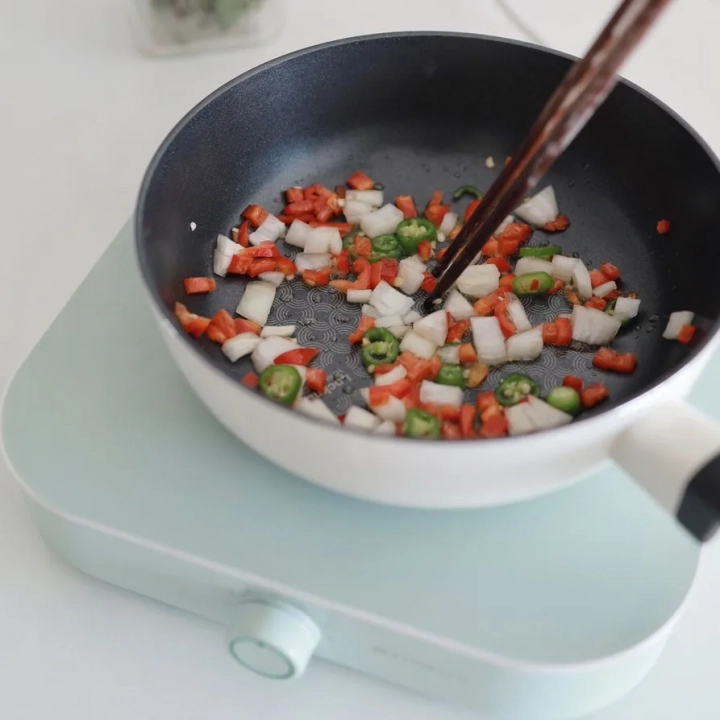 팬에 기름을 두르고 다진 야채들을 볶아주세요.