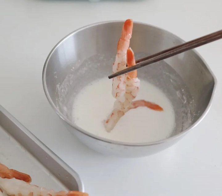 새우를 튀김반죽에 골고루 묻혀주세요.