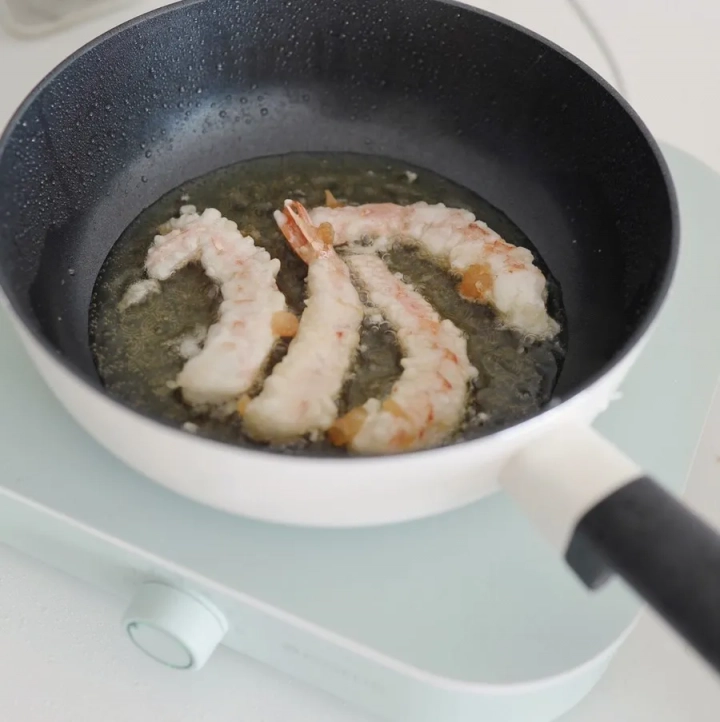 온도를 올려주고 새우를 노릇노릇하게 튀겨주세요.