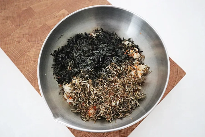 밥에 멸치볶음, 김가루, 당근을 넣고 골고루 섞어주세요.