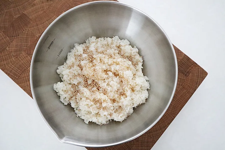 밥에 참기름, 통깨를 넣어 버무려주세요.