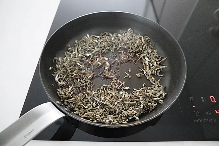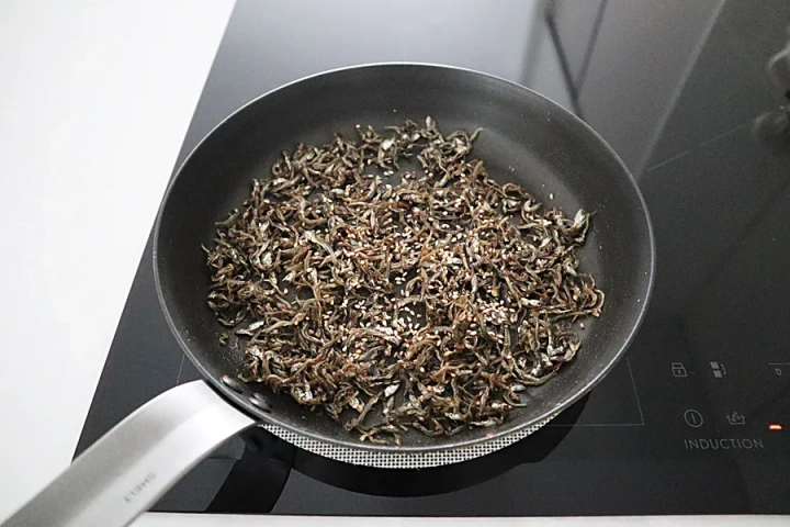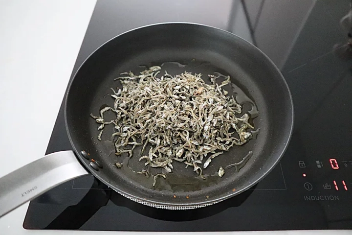달군 팬에 기름을 두르고 멸치를 바삭하게 볶아주세요.