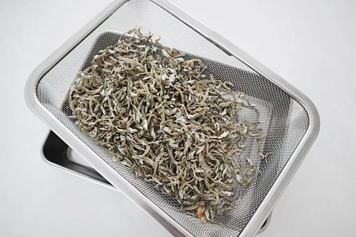 멸치는 체에 받쳐 가루를 털어내주세요.