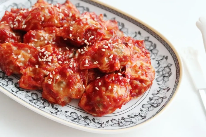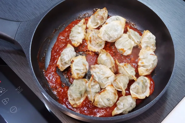 만두 바삭바삭하게 구워 매콤달콤 양념을 더한